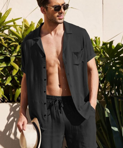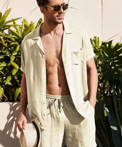 Men Casual Solid Color Lapel Short-Sleeved Shirt Mid-Waist Tethered Shorts Set